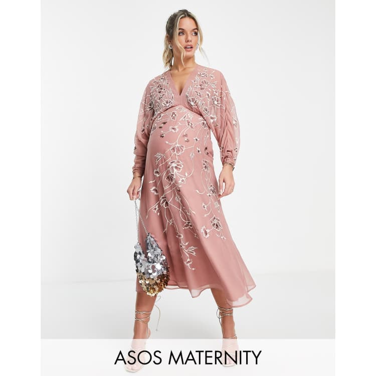 Asos Design Maternity Floral Embroidered Batwing Midi Dress In Rose Asos