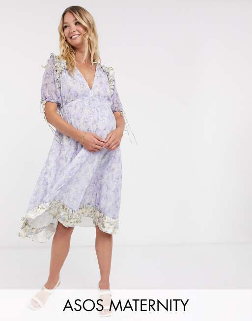 Asos Design Maternity Floral Printed Midi Dress With Satin Trim Ruffle And Tie Detail Asos
