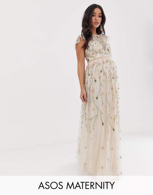 Asos Design Maternity Pretty Embroidered Floral And Sequin Mesh Maxi Dress Asos