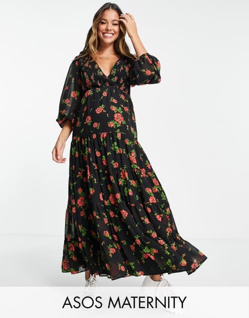 Asos Design Maternity Shirred Wrap Tiered Skirt Maxi Dress In Black Rose Print Asos